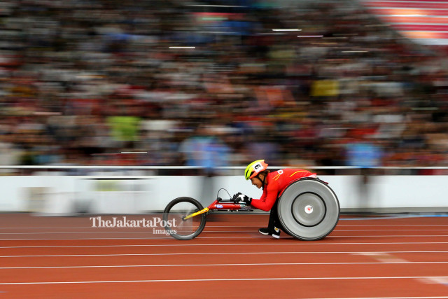 Atlet Putri Cina peraih medali emas Zhou Zhaoqian memacu kursi roda balap pada final 100 meter putri kategori T54 pada Asian Para Games 2018 di Stadion utama Gelora Bung Karno (GBK), Senayan, Rabu (10/10).INAPGOC/TJP Images/Rakhmawaty La'lang/Don/18