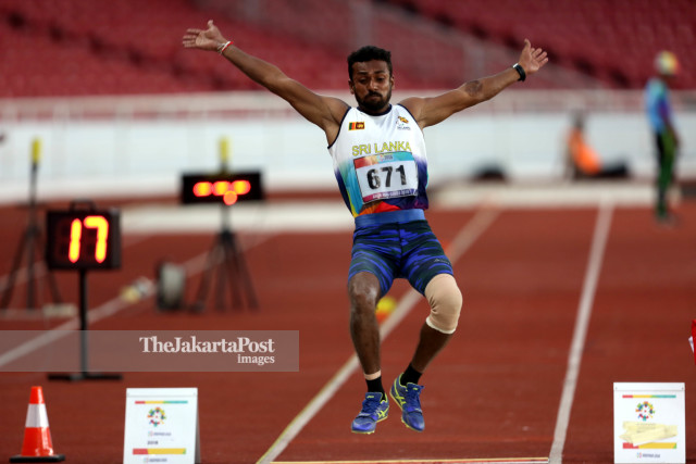 Altlet lompat jauh putra Srilanka Indrapala Charitha Nirmala Buddika melakukan loncatan pada final Asian Para Games 2018 cabang atletik kategori T42,T61/63 putra di Stadion Utama Gelora Bung Karno, Jakarta, Rabu (10/10). Indrapala Charitha Nirmala Buddika memperolah medali emas. INAPGOC/TJP Images/Rakhmawaty La'lang/Don/18