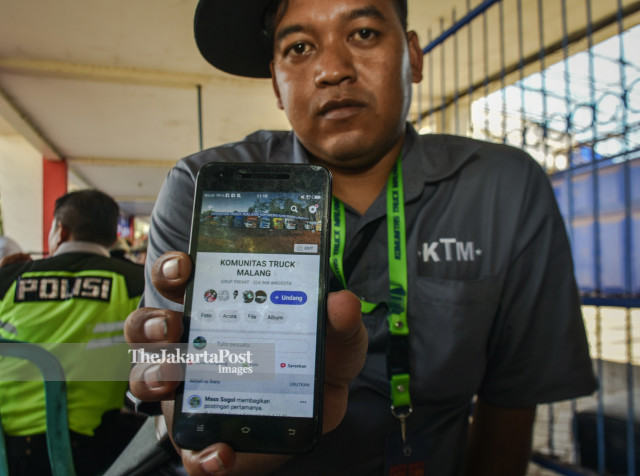 Era sekarang para sopir truk memafaatkan sosial media, untuk komunikasi berbagi perkerjaan dan pertolongan, saat widi Satria menunjukan komunitasnya dalam kegiatan Kopdar (kopi darat) ke-3 komunitas pecinta truk di Stadion Kanjuruhan Malang, Jawa Timur, Minggu (8/12/2019). kegiatan tersebut bertema "Kumpul Boleh Oleng Jangan" diikuti pemilik, sopir, kernet, juragan cabe dan komunitas pecinta truk dari berbagai daerah di Jawa Timur. Untuk meningkatkan silaturahmi dan edukasi tertib berlalu lintas di jalanan. -JP/Aman Rochman/Adi/19