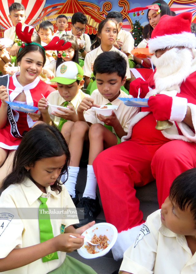 BREAKFAST WITH SANTA Sejumlah siswa SD menikmati sarapan bersama Santa Claus di trotoar Malang Town Square, Malang, Jawa Timur, Rabu (11/12/2019). Sarapan bersama ini sebagai wujud kebersamaan dan suka cita menyambut Natal. Hadirnya Santa Claus diharapkan mampu memberikan kebahagiaan bagi anak-anak. - JP/Nedi Putra AW/Adi/19