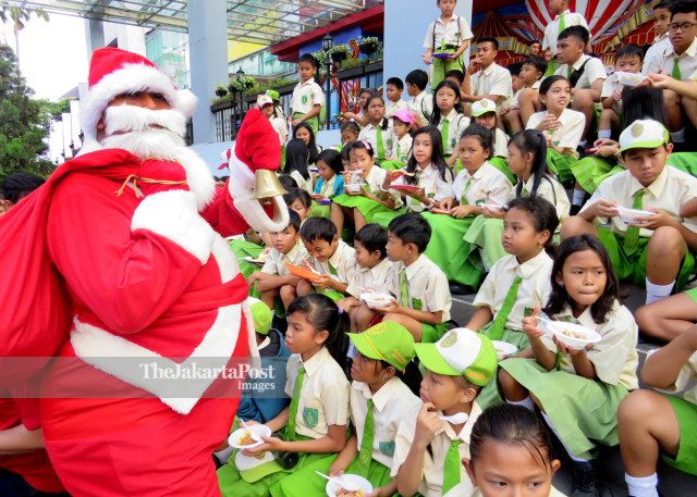 BREAKFAST WITH SANTA: Santa Claus menemani sejumlah siswa SD menikmati sarapan di trotoar Malang Town Square, Malang, Jawa Timur, Rabu (11/12/2019). Sarapan bersama ini sebagai wujud kebersamaan dan suka cita menyambut Natal. Hadirnya Santa Claus diharapkan mampu memberikan kebahagiaan bagi anak-anak. - JP/Nedi Putra AW/Adi/19