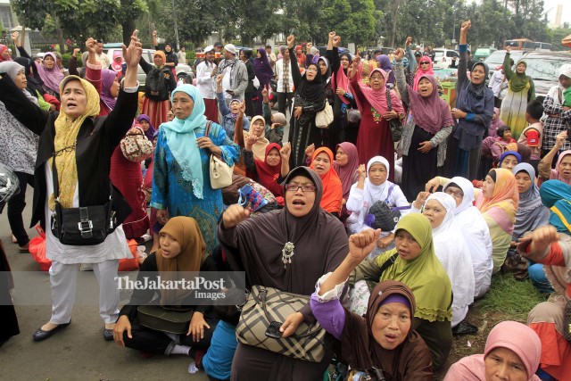 Ratusan simpatisan Gerakan Islam Reformis berunjukrasa mendesak hakim memenangkan gugatan Forum Umat Islam Kota Bekasi terhadap Pemerintah Kota Bekasi yang mengeluarkan Izin Mendirikan Bangunan Gereja St. Stanislaus Kostka Kranggan, Bekasi di Pengadilan Tata Usaha Negara Bandung, Kamis (27/2). Penggugat meminta Pemerintah Kota Bekasi membatalkan dan mencabut izin tersebut karena pemohon izin diduga melakukan penipuan dalam proses pengajuannya. - JP/Arya Dipa/Adi/19