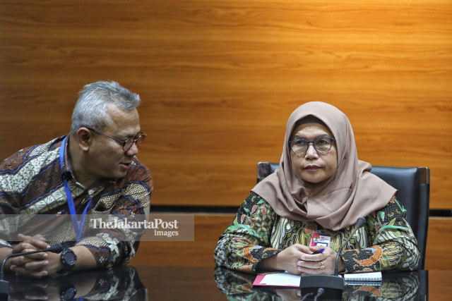 KPK Commissioner Lily Pintauli Siregar accompanied by KPU Chair Arief Budiman spoke at a press conference at the KPK Office, Jakarta, Thursday, January 9, 2020. KPU commissioner Wahyu Setiawan allegedly received Rp600 million in two stages in two steps to smooth out Harun Masiku's request in the interim replacement of members of the Indonesian Parliament. PDIP fraction 2019-2024 in South Sumatra Electoral District. - JP / Seto Wardhana / Adi / 20