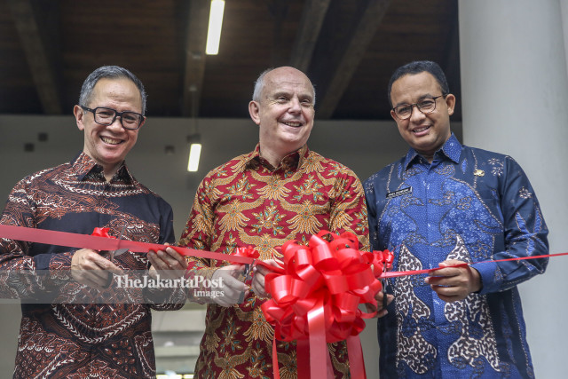 (L-R) Deputy Minister of Foreign Affairs Mahendra Siregar, U.S Ambassador Joseph R. Donovan, and DKI Jakarta Governor Anies Baswedan cut the ribbon during the opening ceremony of the Heritage Building at the United States Embassy, Thursday, Jakarta, Thursday, January 23, 2020. This heritage building within the United States embassy is a luxury villa in the 19th century, the German consulate office in 1926-1942 and is the office and residence of the Indonesian delegation led by Prime Minister Sjahrir. - JP/Seto Wardhana/vja/20