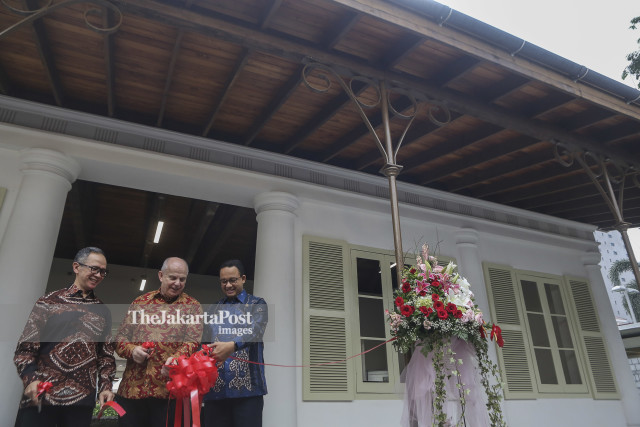 (L-R) Deputy Minister of Foreign Affairs Mahendra Siregar, U.S Ambassador Joseph R. Donovan, and DKI Jakarta Governor Anies Baswedan cut the ribbon during the opening ceremony of the Heritage Building at the United States Embassy, Thursday, Jakarta, Thursday, January 23, 2020. This heritage building within the United States embassy is a luxury villa in the 19th century, the German consulate office in 1926-1942 and is the office and residence of the Indonesian delegation led by Prime Minister Sjahrir. - JP/Seto Wardhana/vja/20