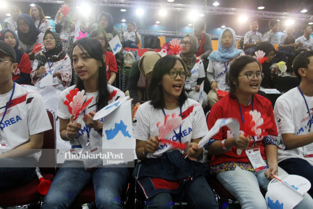 Sejumlah orang yang dihimpun oleh pusat kebudayaan Korea di Indonesia memberikan dukungan kepada para atlet tenis meja Korea yang sedang bertanding pada Asian Para Games 2018 di Ecovention Ancol Jakarta, Kamis (11/10/2018). (FOTO/INAPGOC/Dwi Prasetyo)