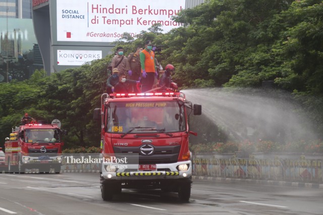 City workers sprayed disinfectant in the Sudirman area, Jakarta, Sunday, 3/22/2020. Disinfectant spraying of the public facility is an effort to anticipate the continued spread of the Covid-19 virus in Jakarta. - JP/Wendra Ajistyatama/vja/20