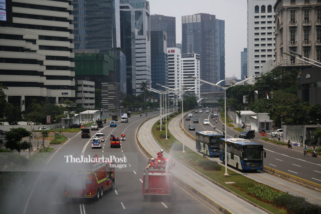 Firefighters worked together with several related parties about the handling of the Covid-19 virus, spraying disinfectants with fire engines on the Jakarta city protocol road, Jl. M.H. Thamrin and Jl. Jendral Sudirman (Monday, March 30, 2020). Jakarta became a empty city t after many citizens were stayed at home amid covid-19 outbreak. - JP / P.J.Leo / leo / 20