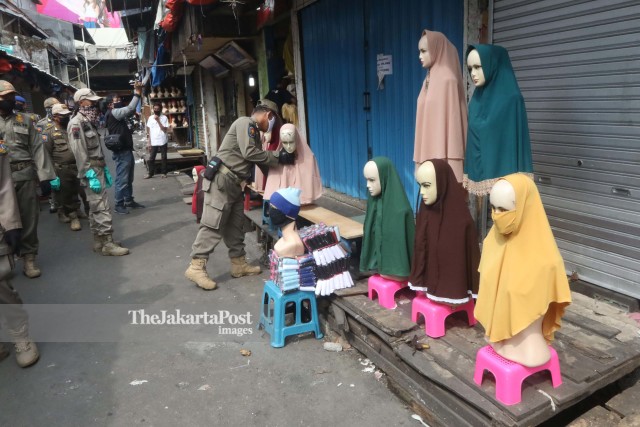 Satpol PP officers discipline traders who are still desperate to sell on Jalan Jatibaru, Tanah Abang, Central Jakarta, Wednesday (5/27/2020). This policing is a part of enforcing the rules of Large-Scale Social Restrictions (PSBB) in reducing the spread of Covid-19 in Jakarta. -JP / Dhoni Setiawan / Adi / 20
