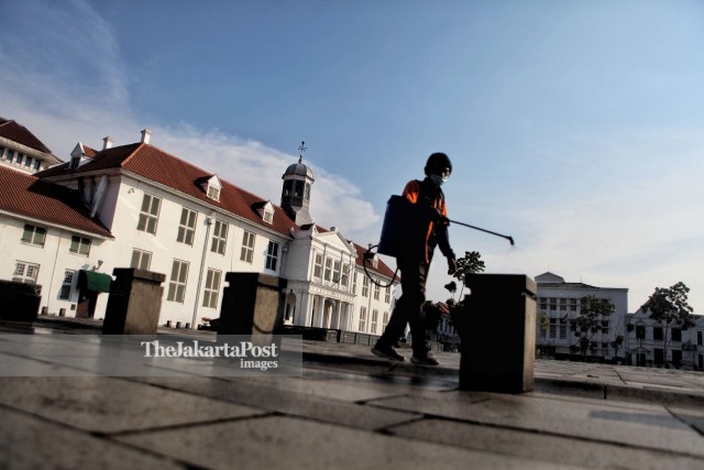 UPK Kota Tua Staff sprays disinfectant solution at Kota Tua area in West Jakarta, Tuesday, June 2, 2020. DKI Jakarta Governor Anies Rasyid Baswedan stated that Jakarta will implement the transition ti the New Normal Policy only if the third phase of the large-scale social restriction (PSBB) policy, that will end on June 4, 2020, was successful. -JP/Seto Wardhana/Adi/20