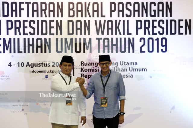 Presidential candidate Prabowo Subianto and running mate Sandiaga Uno pose after registering their candidacy with the General Elections Commission (KPU) on Friday, August 10, 2018. TJPimages/Dhoni Setiawan/wd/18